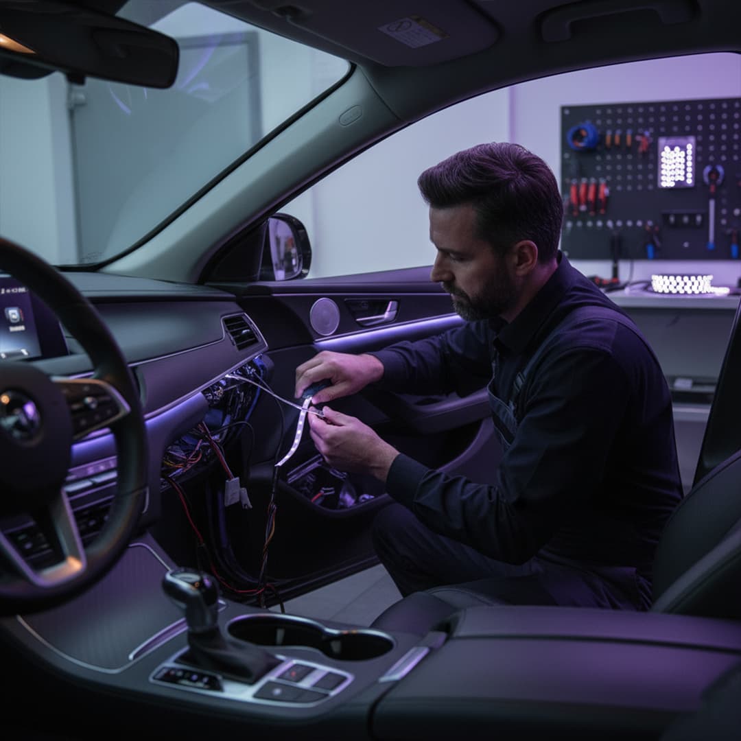 Component removal and preparation. Discreet wiring and cable management. LED strip placement and securing. Controller and power integration.